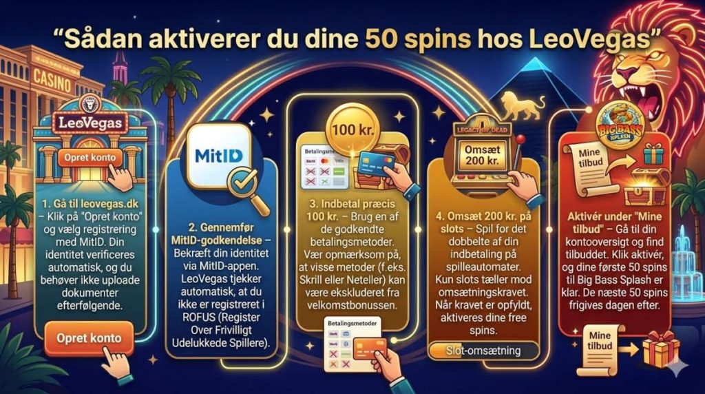 For at få free spins hos LeoVegas skal du oprette en konto med MitID, indbetale 100 kr., omsætte for 200 kr. på slots, og aktivere dit tilbud under “Mine tilbud”. Du modtager herefter 100 free spins til spilleautomaten Big Bass Splash til en værdi af 1 kr. per spin. Spinnene fordeles over to dage (50+50) og er gyldige i 72 timer efter aktivering.