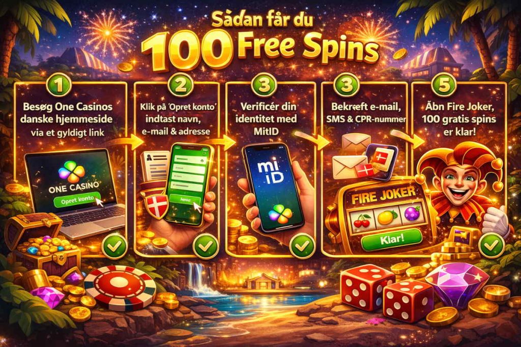 One Casino tilbyder i 2026 100 free spins uden indbetaling til alle nye danske spillere. Spinsene tildeles automatisk på Play’n GO-automaten Fire Joker, når du opretter en konto og verificerer din identitet med MitID. Der kræves ingen bonuskode – tilbuddet aktiveres af sig selv efter registrering og SMS-verificering med CPR.